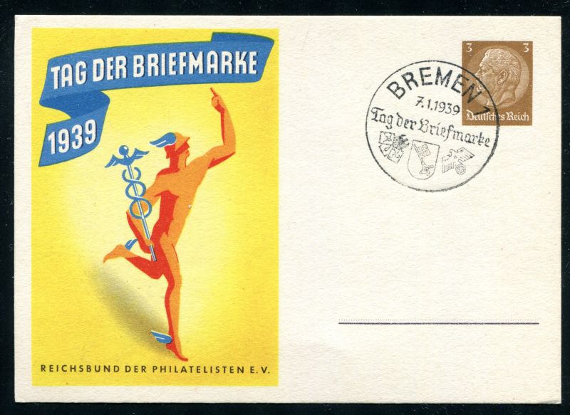 P 239/01 Ganzsache, Postkarte, 1939 Tag der Briefmarke mit Sonderstempel 7.1.39 Bremen, Nr. 9037