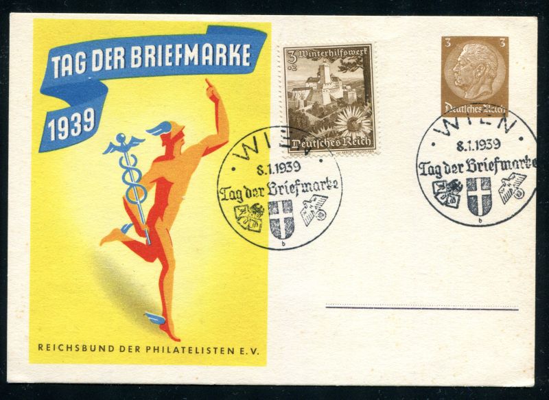 P 239/01 Ganzsache, Postkarte, 1939 Tag der Briefmarke mit Zusatzfrankatur und 2 mal Sonderstempel "WIEN 8.1.39" Nr. 9038