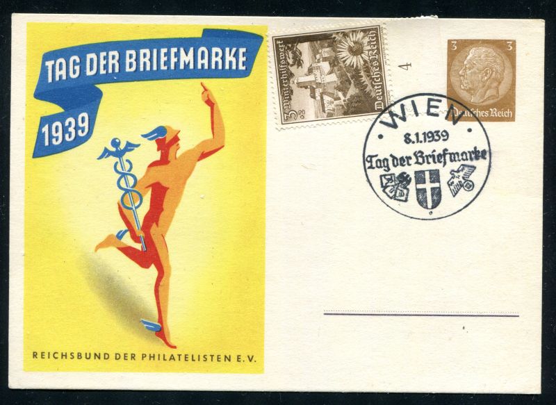 P 239/01 Ganzsache, Postkarte, 1939 Tag der Briefmarke mit Zusatzfrankatur und 2 mal Sonderstempel "WIEN 8.1.39" Nr. 9039