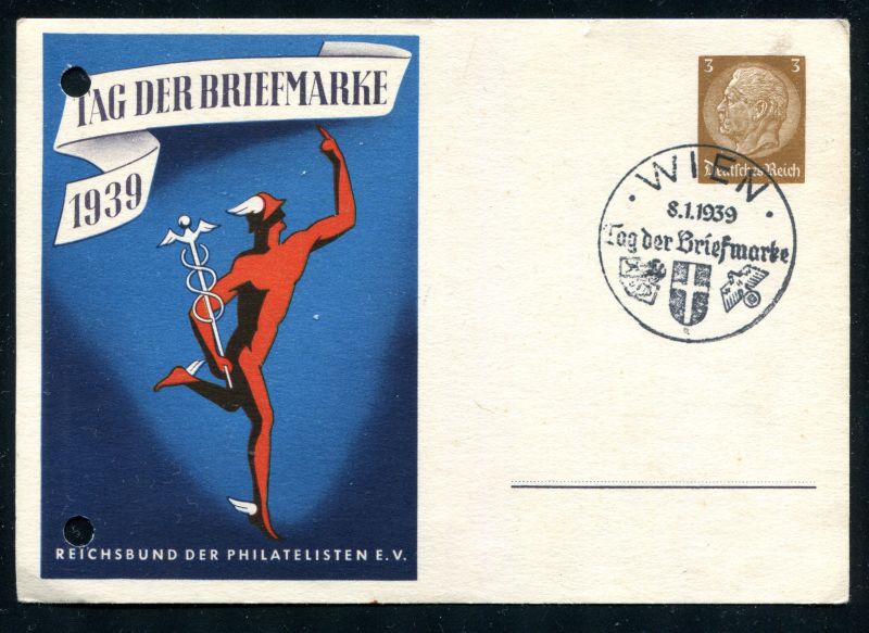 P 239/02 Ganzsache, Postkarte, 1939 Tag der Briefmarke mit Sonderstempel "WIEN 8.1.39", gelocht. Nr. 9040