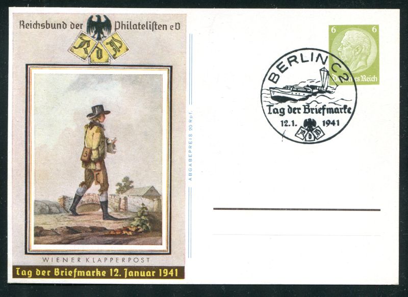 P 241 Ganzsache, Postkarte, 1941 Sonderpostkarte zum Tag der Briefmarke am 12.1.1941 mit Ersttags - Sondertempel "BERLIN C2 12.1.1941 Nr. 9044