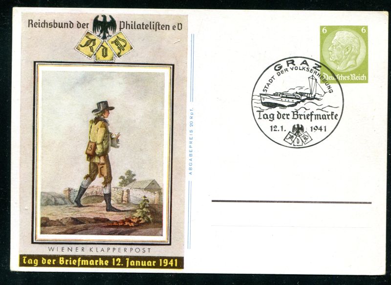 P 241 Ganzsache, Postkarte, 1941 Sonderpostkarte zum Tag der Briefmarke am 12.1.1941 mit Ersttags - Sondertempel "GRAZ" 12.1.1941 Nr. 9046