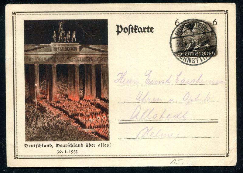 P 250 Ganzsache, Postkarte, 1933 Sonderpostkarte Brandenburger Tor. "Deutschland, Deutschland über alles" 30.1.1933" mit Tagesstempel HOHENSTEIN 25.4.34 nach Alsfeld. Nr. 9061