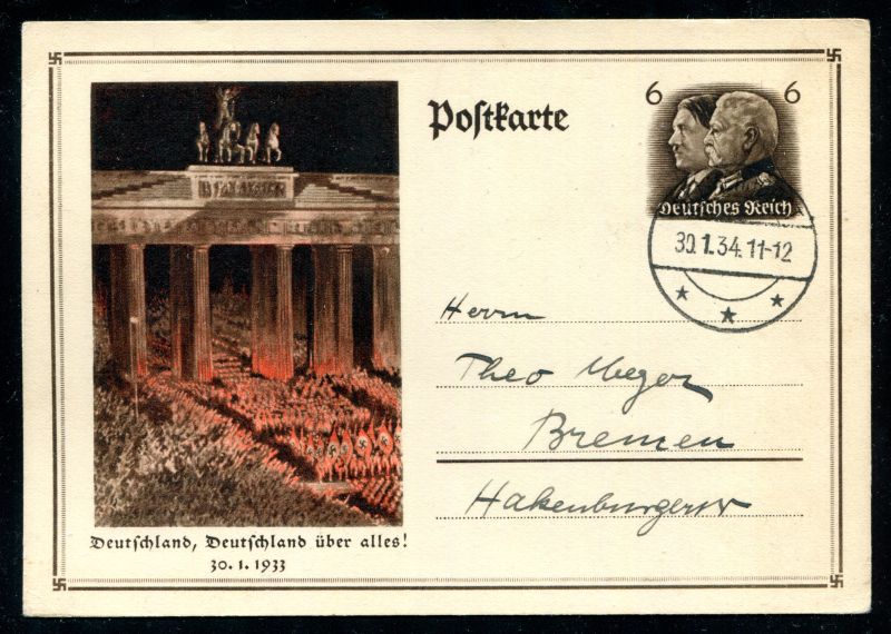 P 250 Ganzsache, Postkarte, 1933 Sonderpostkarte Brandenburger Tor. "Deutschland, Deutschland über alles" 30.1.1933" mit Tagesstempel nach Bremen. Nr. 9064