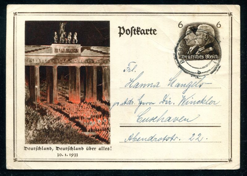 P 250 Ganzsache, Postkarte, 1933 Sonderpostkarte Brandenburger Tor. "Deutschland, Deutschland über alles" 30.1.1933" mit Tagesstempel nach Cuxhaven. Nr. 9065