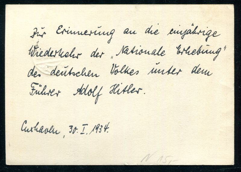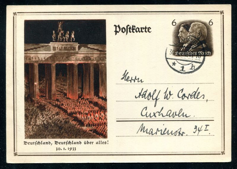 P 250 Ganzsache, Postkarte, 1933 Sonderpostkarte Brandenburger Tor. "Deutschland, Deutschland über alles" 30.1.1933" mit Tagesstempel Cuxhaven nach Cuxhaven, Nr. 9066