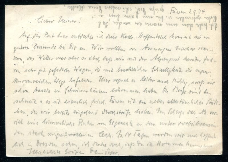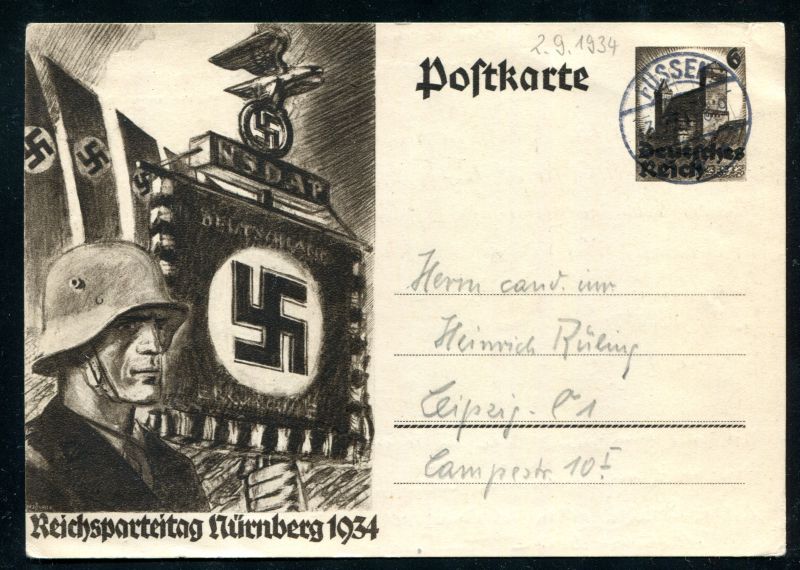 P 252 Ganzsache, Postkarte, 1934 Sonderpostkarte. Reichsparteitag Nürnberg 1. September 1934 mit Tagesstempel Füssen nach Leipzig. Bild SS-Mann mit Standarte. Nr. 9075