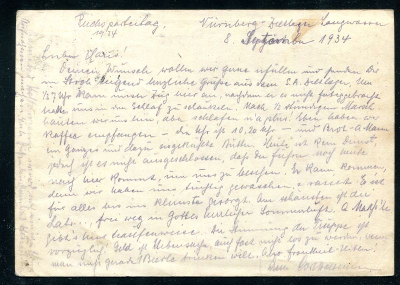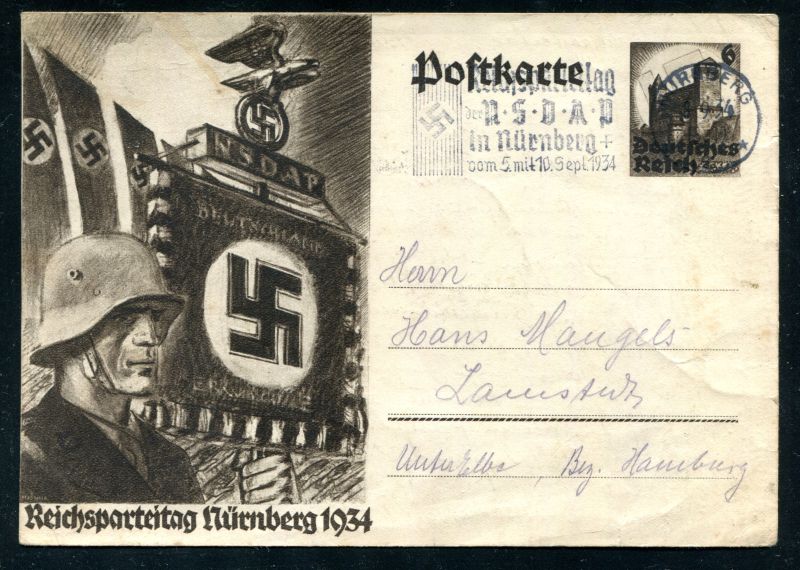 P 252 Ganzsache, Postkarte, 1934 Sonderpostkarte. Reichsparteitag Nürnberg 1. September 1934 mit Parteitagsstempel der NSDAP befördert nach Lamstedt. Bild SS-Mann mit Standarte. Nr. 9076