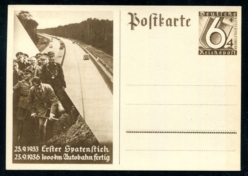 P 263 Ganzsache, Postkarte, 1936 Sonderpostkarte. Erster Spatenstich 23.9.1936 1000 km Autobahn fertig, ungebraucht. Nr. 9091