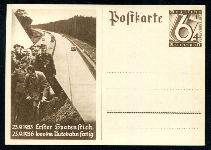 P 263 Ganzsache, Postkarte, 1936 Sonderpostkarte. Erster Spatenstich 23.9.1936 1000 km Autobahn fertig, ungebraucht. Nr. 9092