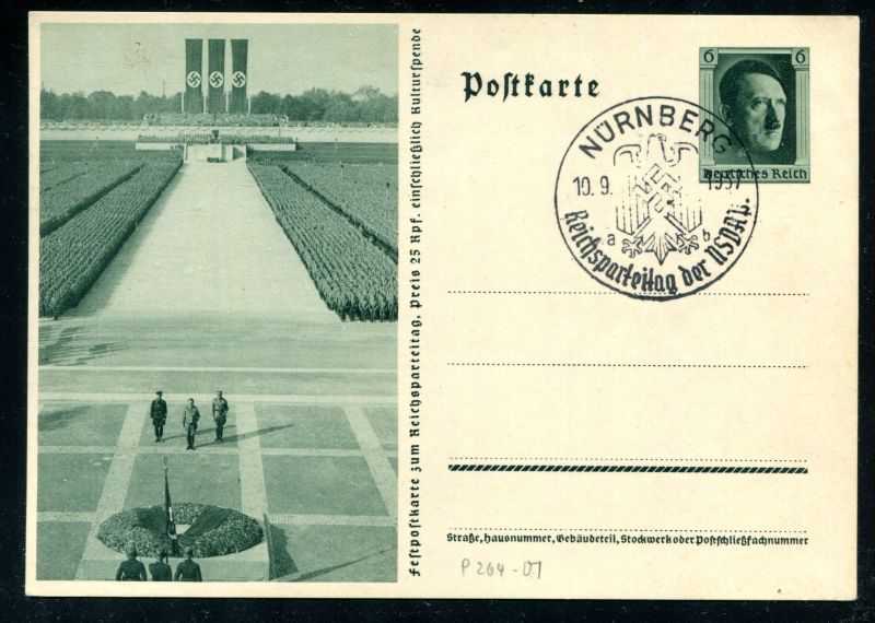 P 264/01 Ganzsache, Postkarte, 1937 Sonderpostkarte. Apell der SS, mit Parteitags - Sonderstempel Nürnberg 19.9.37 Nr. 9100