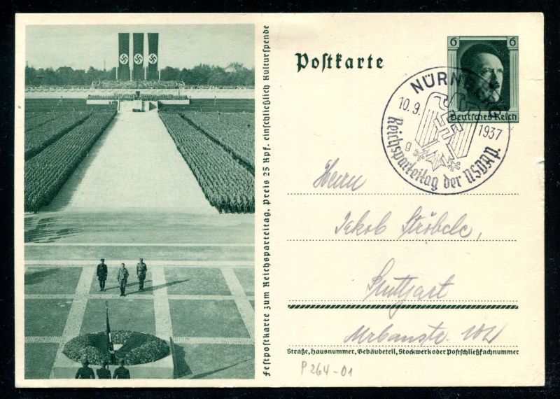P 264/01 Ganzsache, Postkarte, 1937 Sonderpostkarte. Apell der SS, mit Parteitags - Sonderstempel Nürnberg 10.9.37 echt befördert nach Stuttgart. Nr. 9101