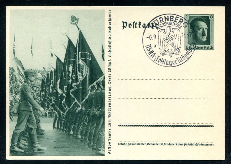 P 264/02 Ganzsache, Postkarte, 1937 Sonderpostkarte. Vorbeimarsch des Arbeitsdienstes, mit Reichstags - Sonderstempel Zeltlager 6.9.1937. Nr. 9104