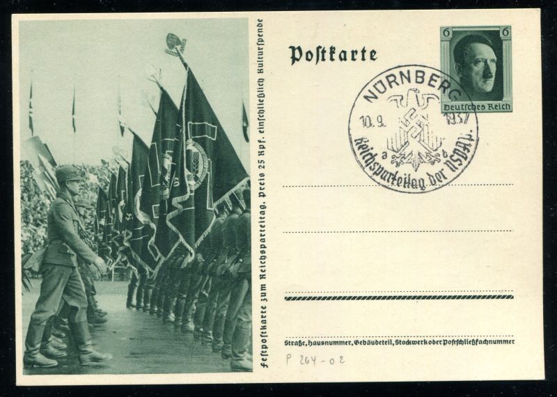 P 264/02 Ganzsache, Postkarte, 1937 Sonderpostkarte. Vorbeimarsch des Arbeitsdienstes, mit Reichsparteitags - Sonderstempel Nürnberg 6.9.1937. Nr. 9106