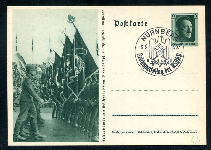 P 264/02 Ganzsache, Postkarte, 1937 Sonderpostkarte. Vorbeimarsch des Arbeitsdienstes, mit Reichsparteitags - Sonderstempel Nürnberg 6.9.1937 der NSDAP. Nr. 9109