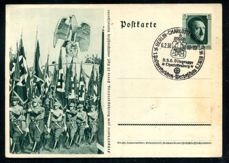 P 264/03 Ganzsache, Postkarte, 1937 Sonderpostkarte. Einmarsch der SS - Fahnen, mit Berliner Werbeschau - Stempel 6.2.38 Reichsparteitags - Sonderstempel Nürnberg 6.9.1937 der NSDAP. Nr. 9110