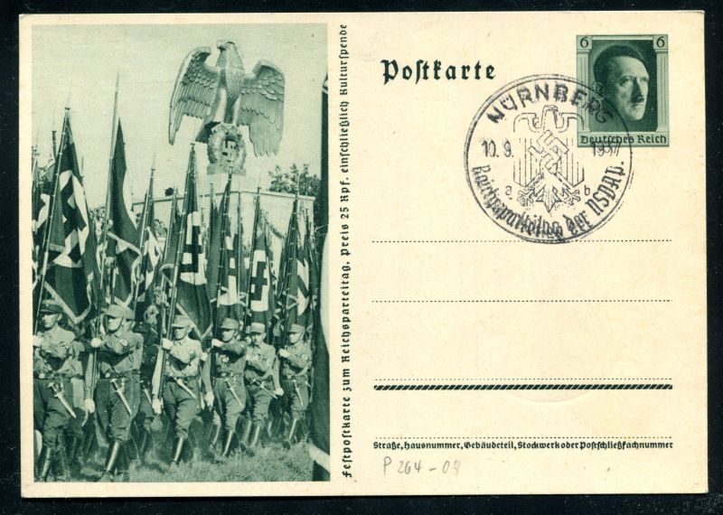 P 264/03 Ganzsache, Postkarte, 1937 Sonderpostkarte. Einmarsch der SS - Fahnen, mit Reichsparteitags - Sonderstempel Nürnberg 10.9.1937 der NSDAP. Nr. 9112