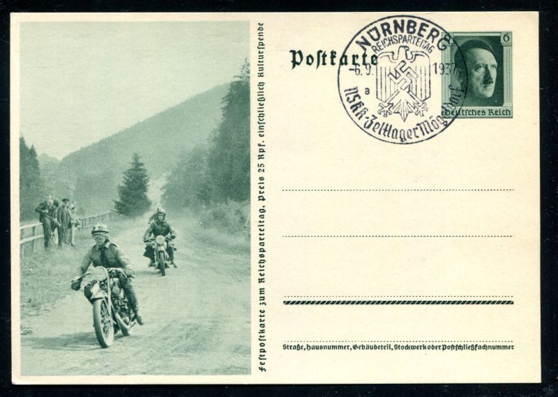 P 264/05 Ganzsache, Postkarte, 1937 Sonderpostkarte. NSKK (NS - Kraftfahrer - Korps), mit Sonderstempel Nürnberg Reichsparteitag 6.9.1937 NSKK Zeltlager. Nr. 9118