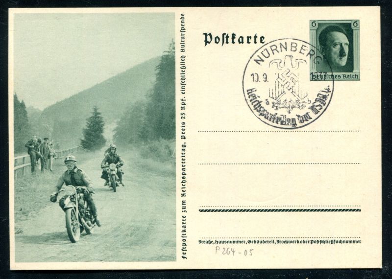 P 264/05 Ganzsache, Postkarte, 1937 Sonderpostkarte. NSKK (NS - Kraftfahrer - Korps), mit Sonderstempel Nürnberg Reichsparteitag 10.9.1937 der NSDAP. Nr. 9119