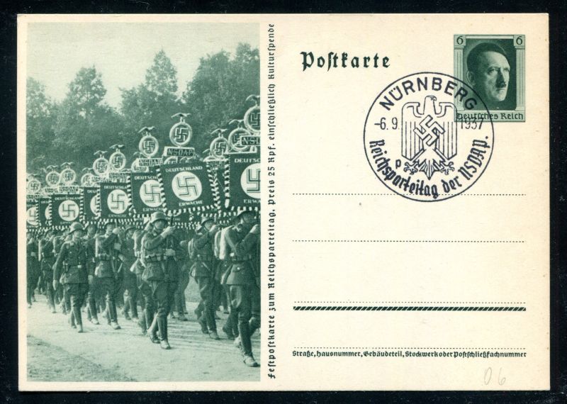 P 264/06 Ganzsache, Postkarte, 1937 Sonderpostkarte. Standarten der SS. Sonderstempel 6.9.1937 Reichsparteitag der NSDAP. Nr. 9129