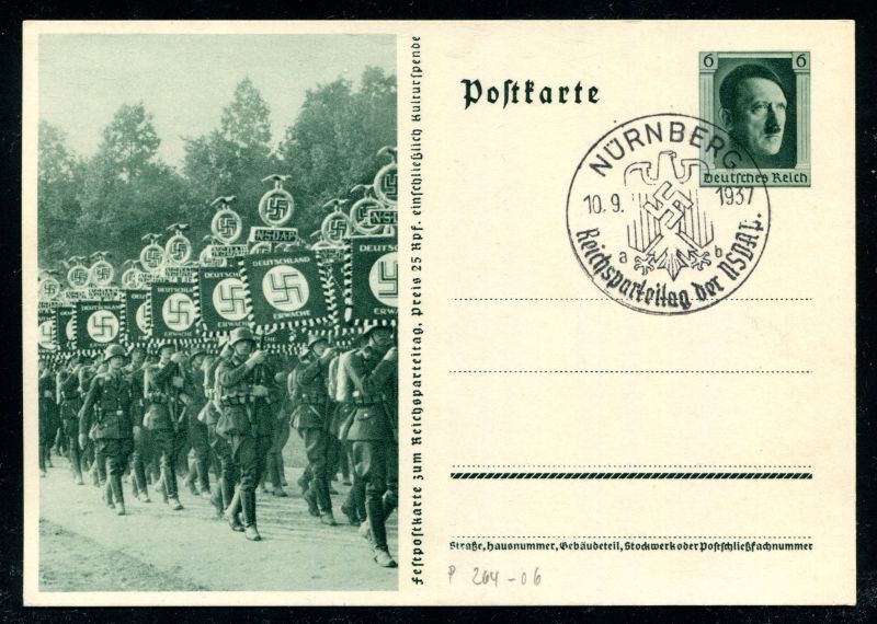 P 264/06 Ganzsache, Postkarte, 1937 Sonderpostkarte. Standarten der SS. Sonderstempel 10.9.1937 Reichsparteitag der NSDAP. Nr. 9130