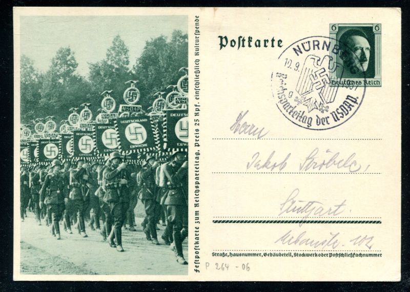 P 264/06 Ganzsache, Postkarte, 1937 Sonderpostkarte. Standarten der SS. Sonderstempel 10.9.1937 Reichsparteitag der NSDAP. Nr. 9131
