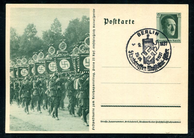 P 264/06 Ganzsache, Postkarte, 1937 Sonderpostkarte. Standarten der SS. Sonderstempel 10.9.1937 Berlin Staatstreffen Mussolini - Hitler. Nr. 9132