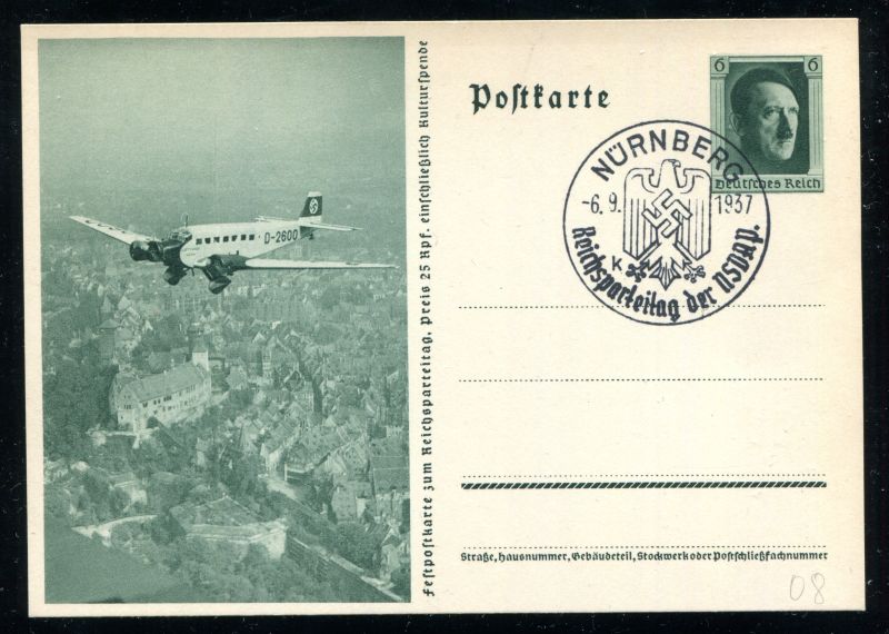 P 264/08 Ganzsache, Postkarte, 1937 Sonderpostkarte. Hitlers Flugzeug über Nürnberg, Sonderstempel Nürnberg 6.9.1937 Reichsparteitag der NSDAP. Nr. 9139