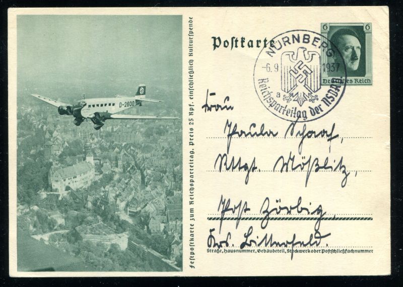 P 264/08 Ganzsache, Postkarte, 1937 Sonderpostkarte. Hitlers Flugzeug über Nürnberg, Sonderstempel Nürnberg 6.9.1937 Reichsparteitag der NSDAP. Echt befördert. Nr. 9142