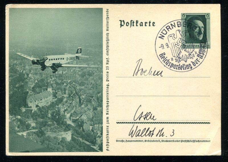 P 264/08 Ganzsache, Postkarte, 1937 Sonderpostkarte. Hitlers Flugzeug über Nürnberg, Sonderstempel Nürnberg 9.9.1937 Reichsparteitag der NSDAP. Echt befördert. Nr. 9143