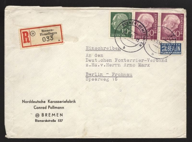 1954 Mi.Nr. 188 , , , MiF, 40 Pfennig Heuss, mit Zusatzfrankatur Nr. 183 10 Pfennig ab Bremen - Hemelingen 26.8.54 nach Berlin - Frohnau, rs. mit Ankunftstempel.
