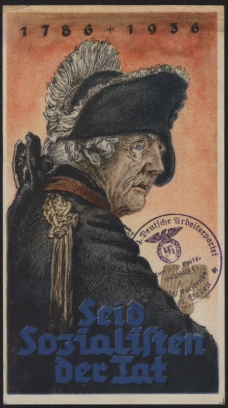 1786 1936 Farbfoto der Alte Fritz. "Seid Sozialisten der Tat", mit Sonderstempel (Deutsche Arbeiterpartei Karlsruhe)