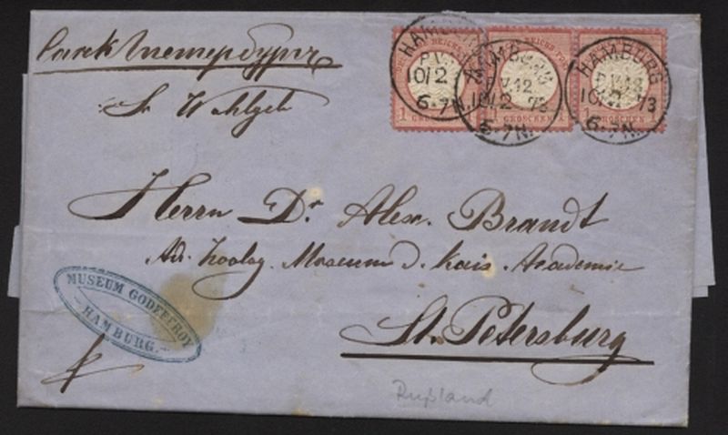1872 Mi.Nr. 19 , , MeF, mit Mängel und Einzelmarke 1 Groschen auf Faltbrief von Hamburg nach St. Petersburg rs. mit div. Ankunftstempeln.