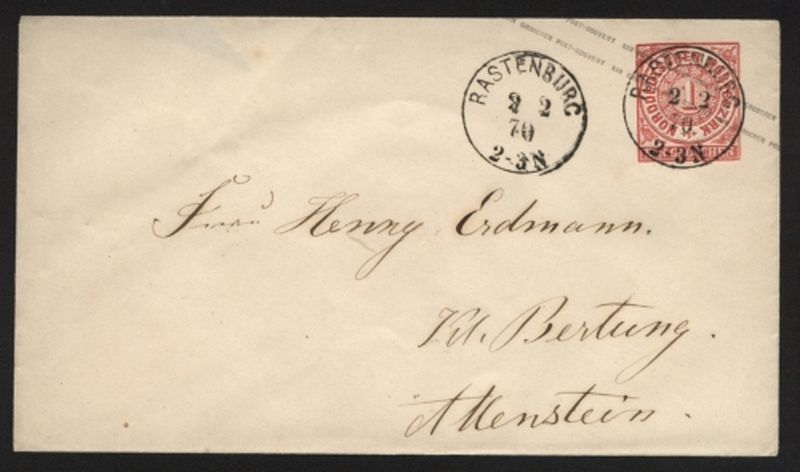 LIQUIDATIONSPOSTEN. 1868 Mi.Nr. U1 Ganzsachenumschlag, 1 Groschen Große Wertziffer, ab "RASTENBURG 2 2 70 2-3N"
