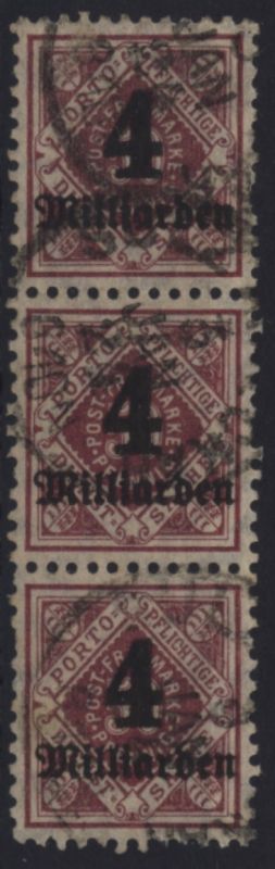 LIQUIDATIONSPOSTEN. 1923 Mi.Nr. 182 , Dienstmarken Ziffern 4 Mrd. auf 50 Pf im 3er Streifen, Zähnung unregelmäßig. Mi.(420.--)Euro.