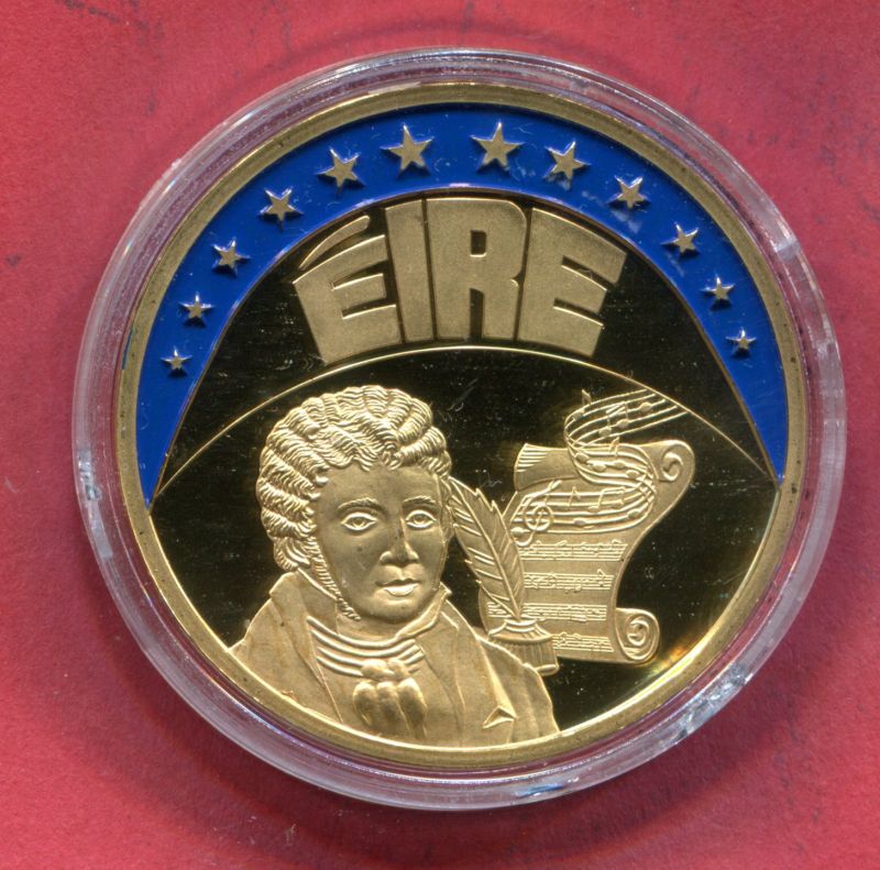 1999 Irland. Farb - ECU - Sonderprägung vergoldet in PP, 32 Gramm, 40 mm. Vorderseite John Field 12 Sterne in ein "Blaues Feld", rs. Raub der Europa.
