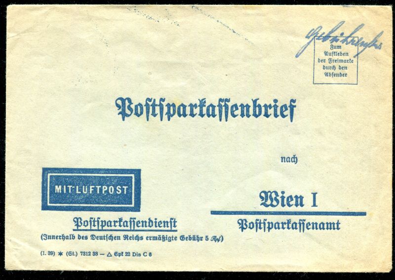 Postsparkassenbrief nach Wien per Luftpost, handschriftlich "gebührenfrei"