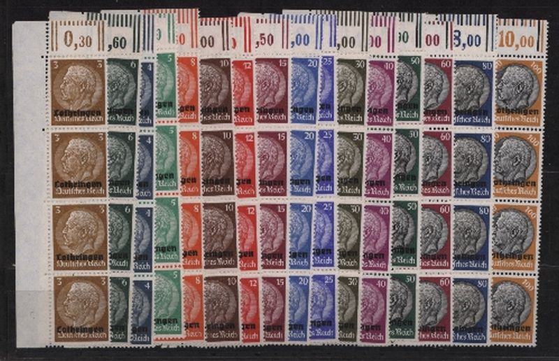 1940 Mi.Nr. 1/16 , Freimarken Hindenburg mit Aufdruck: "Lothringen" kompletter Satz als senkrechter 4er Streifen aus der linken oberen Bogenecke, mit 1 Oberrandmarke im Walzendruck. Mi. (300.--)Euro.