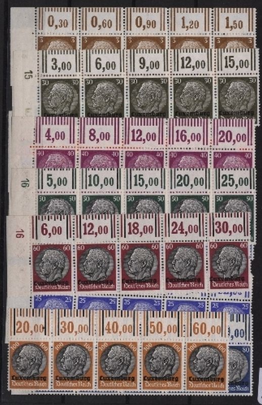 1940 Mi.Nr. 1/16 , Freimarken Hindenburg mit Aufdruck: "Luxemburg" kompletter Satz im wagerechtem 5er Streifen vom Oberrand, oft mit Plattennummer, im Walzendruck, außer 8 Pfennig, diese nur im 5er Streifen waagerecht. Mi. (1000.--)Euro.