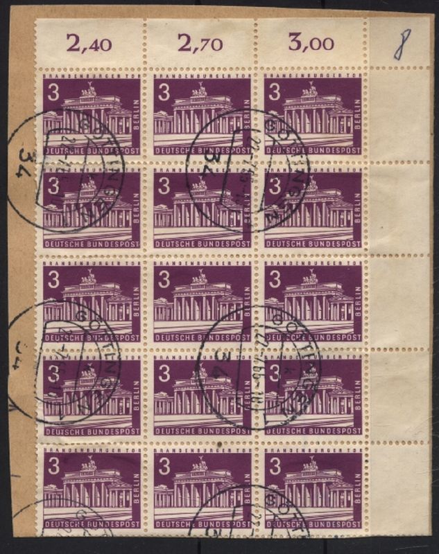 1963 Mi.Nr. 231 , 3 Pfennig Brandenburger Tor im 15er Block, aus der rechten oberen Bogenecke, auf Briefstück. Mi.(150.--)Euro.
