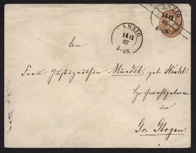 1862 Preußen GA - Brief U 25 B (Format 149,5 : 116), mit 3 Silbergroschen, Adler in Ellipse, Siegelbrief befördert ab DANZIG 14.11.67 nach Groß Glogau. "Brief an Frau Mündel in Groß Glogau".