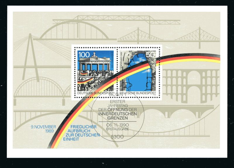 1990 Block 22II , Berliner Mauer mit Plattenfehler (langer gelber Strich im unteren Ende des roten Regenbogenstreifen), selten.