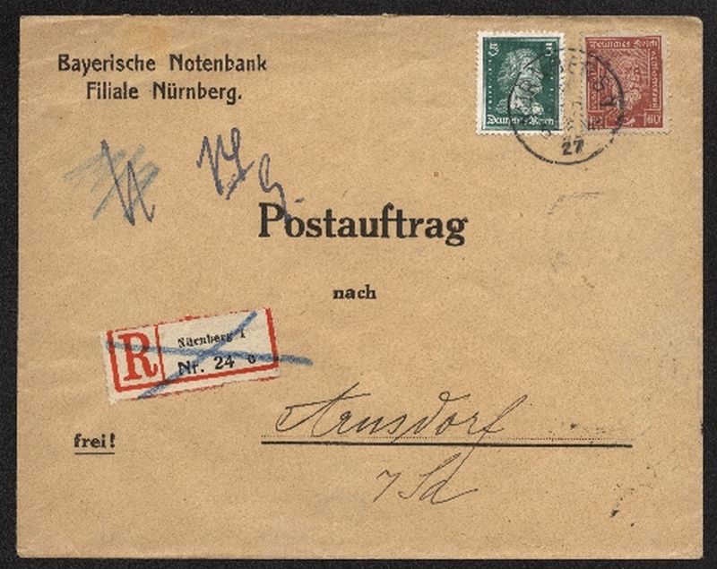 1927 Postauftrag Beleg ab Nürnberg nach Arnsdorf Sachsen, rs. Ankunftstempel 9.9.27.