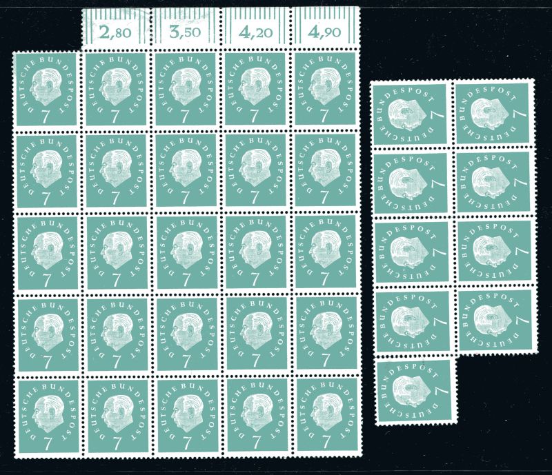 1959 Mi.Nr. 302 , 7 Pfennig Heuss III in 2 Bogenteile, zusammen 34 Marken.