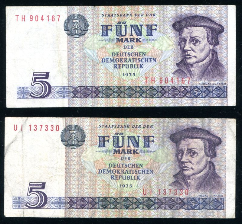 LIQUIDATIONSPOSTEN.1975 DDR 2 Geldscheine 5 Mark, in guter Erhaltung.