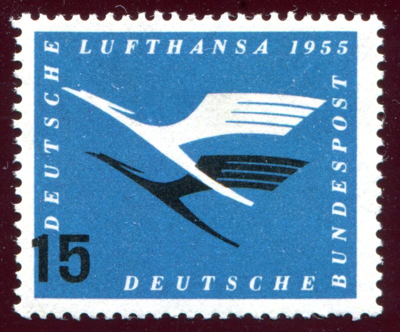 1955 Michel Nr. 207 , 15 Pfennig Lufthansa. Prägeverschiebung der Zahl "1" zum Teil im weißen Seitenrand auf der linken Seite. Im Michel - Katalog nicht vermerkt. Sehr Selten.
