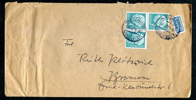 1954 Mi.Nr. 181 , , , im 3er Block. 7 Pfennig Heuss I mit 2 Pfennig Nothilfe, befördert nach Bremen. Mi.(200.--)Euro.