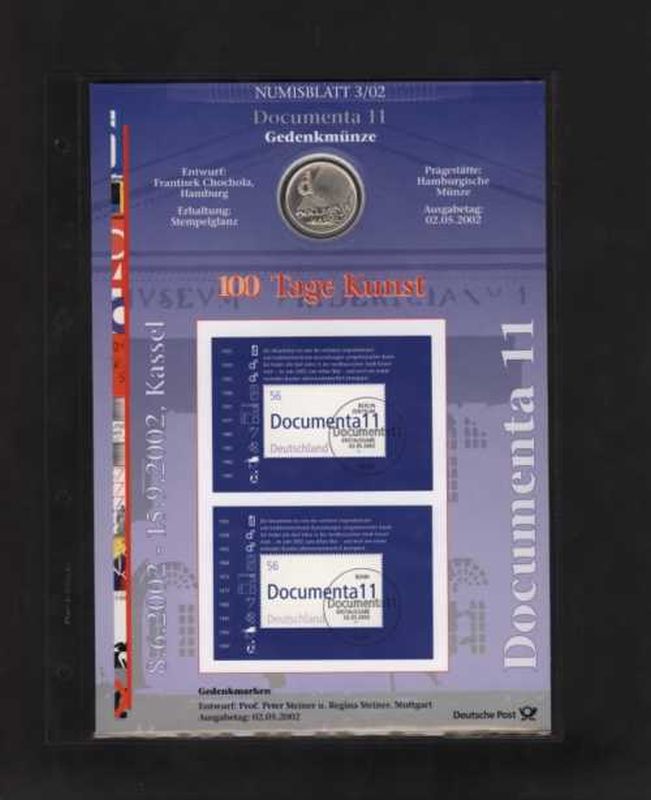 Numisblatt 2002/3 100 Tage Kunst. Documenta 11 in Kassel, mit 10 EURO Sondermünze und Bundesrepublik Block 58 2 Stück.