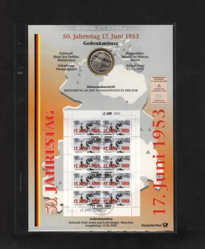 Numisblatt 2003/3 50. Jahrestag des Volksaufstandes vom 17. Juni 1953, mit 10 EURO Sondermünze und Bundesrepublik Kleinbogen Nr. 2342