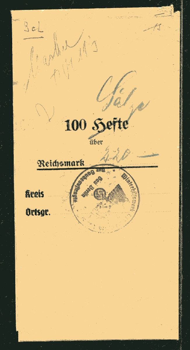 1938 Streifband über 100 (Hefte) Hefte durchgestrichen "Sätze" überschrieben, an Winterhilfswerk Kreis-Ortsg., mit Sonderstempel (Berlin W 62 Tag der Briefmarke 9.1.38)